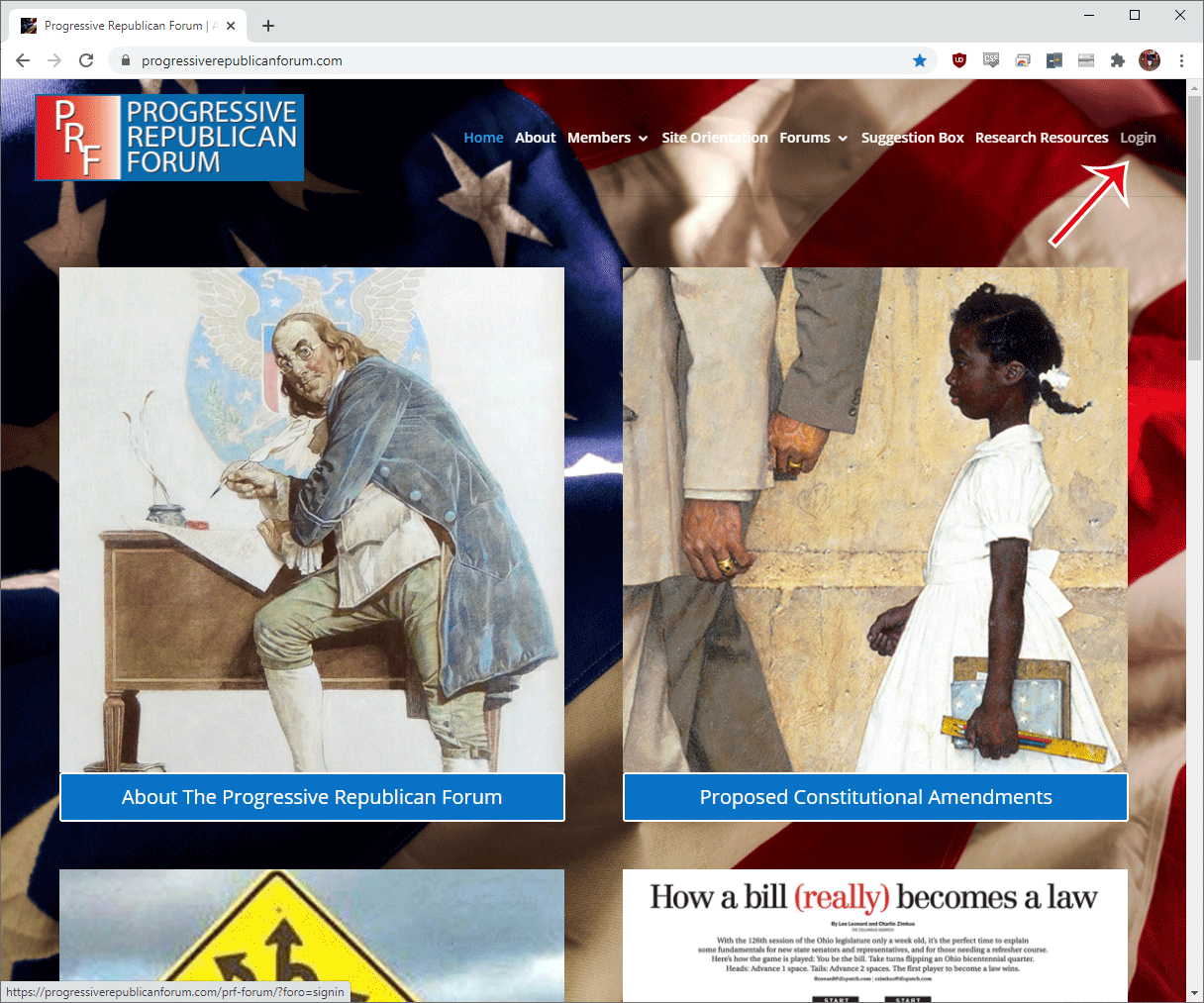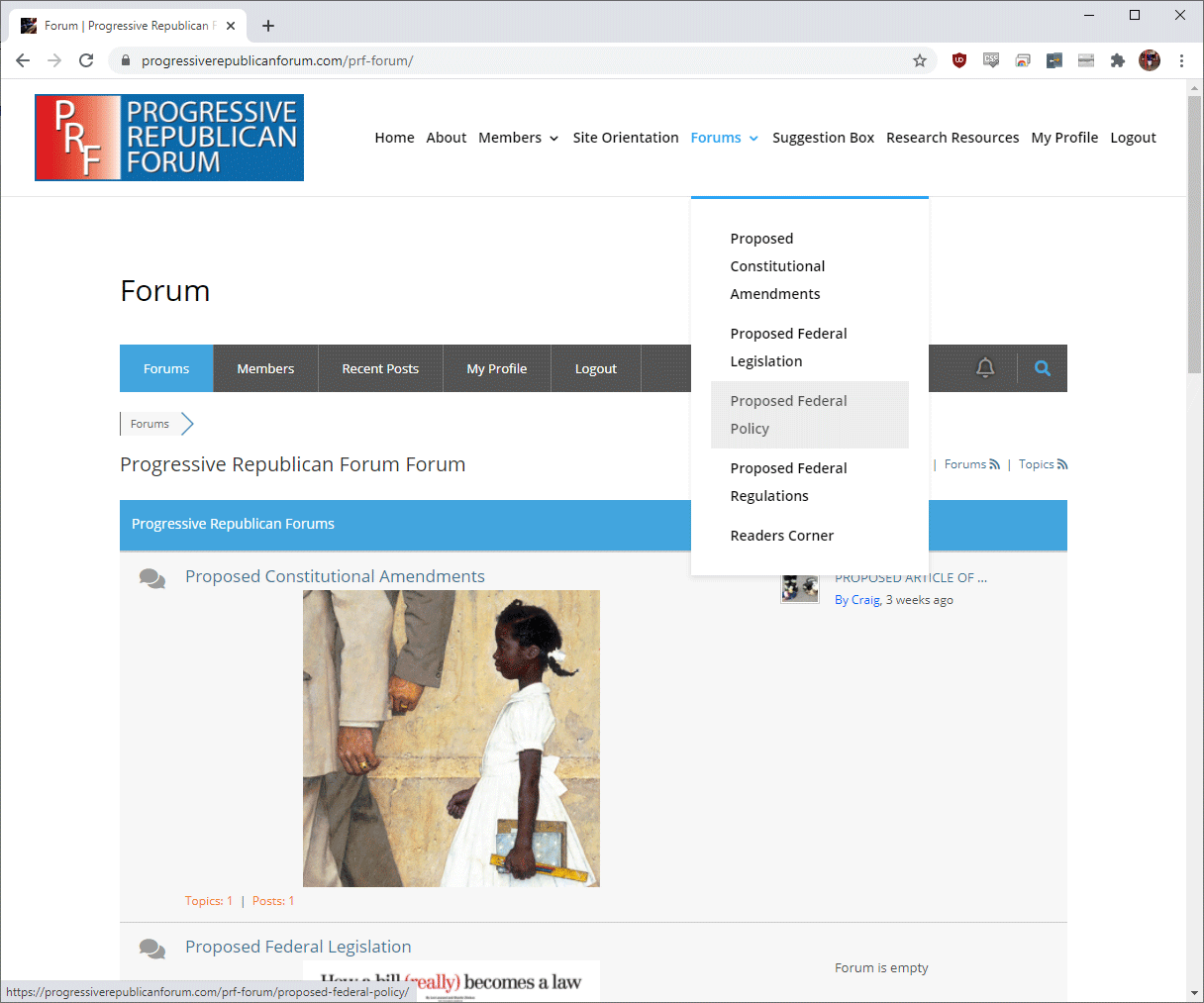The site is divided into 5 Major Forums: Proposed Constitutional Amendments, Proposed Federal Legislation, Proposed Federal Regulations, Proposed Federal Policy and Reader’s Corner (Book Reviews).