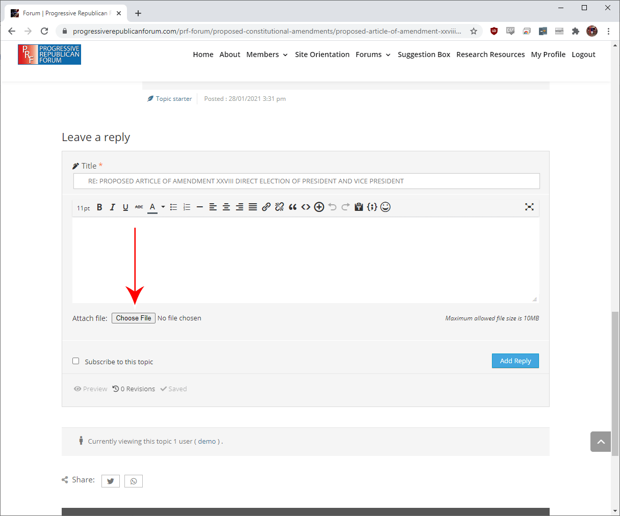 While creating your topic or replying to topic, select the “Choose File” button below the text editing area.